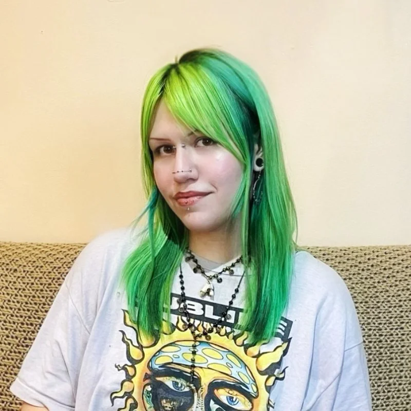 She specializes in alternative haircuts and works with all hair types, using both razor and shears to create intentional, lived-in shapes that align with each client’s vision and real life. Her second passion is vivid color, with a strong affinity for color blocking, design and pattern placement, and dimensional or lived-in work. She also works with grey blending and supports intentional transitions into natural grey.